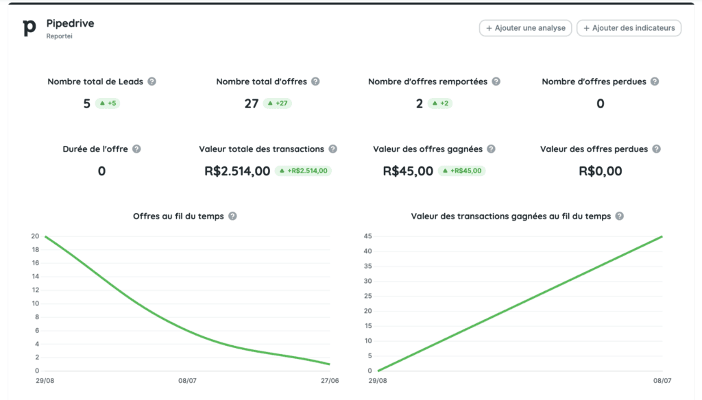 Dans le rapport de Pipedrive de Reportei, vous trouverez les principales métriques pour analyser les performances de vos actions.