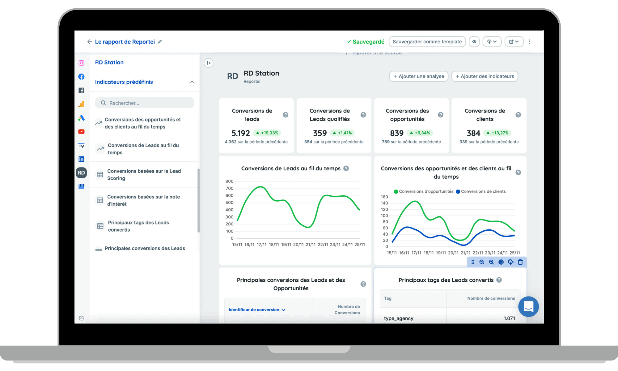 En plus des rapports RD Station, vous pouvez également générer des rapports Instagram, Facebook et Facebook Ads, Google Analytics, Google Ads, YouTube, LinkedIn et LinkedIn Ads, Google Search Console, Google My Business, Mailchimp et RD Station CRM. Trouvez le plan idéal pour vos projets et générer des rapports complets, personnalisés et objectifs pour vos clients !