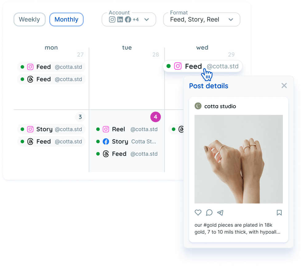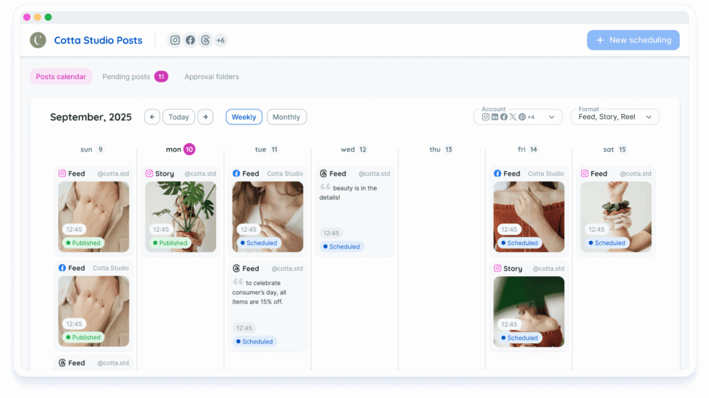 Para agências, empresas, social medias e freelancers que precisam agendar posts para redes como Instagram, Facebook, TikTok, Threads e LinkedIn, organizar tarefas e acelerar aprovações de conteúdo. Tudo isso com um calendário intuitivo e fluxos de trabalho visuais.