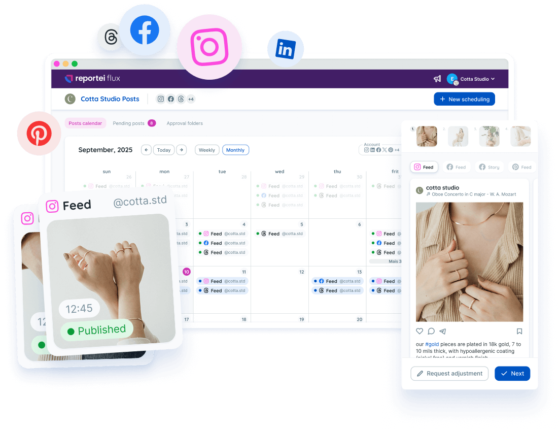 O Reportei Flux é uma plataforma de agendamento de posts, aprovação de conteúdo e gestão de redes sociais para equipes de marketing, social medias e agências . Com ele, você programa posts para Instagram, Facebook, TikTok, Threads, LinkedIn, Pinterest e outras redes de forma rápida, em um único fluxo.