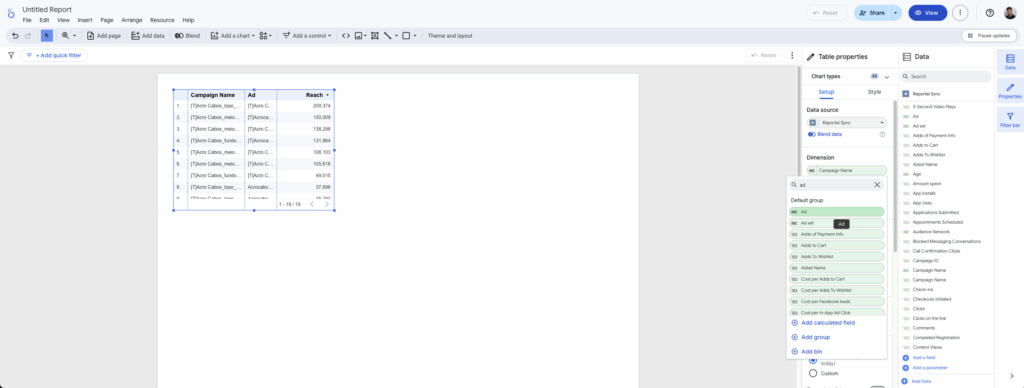 9. From here, you can edit the table, add charts, and compare periods. For a better overview, you can also pull data from multiple platforms into the same dashboard and cross-reference that information: