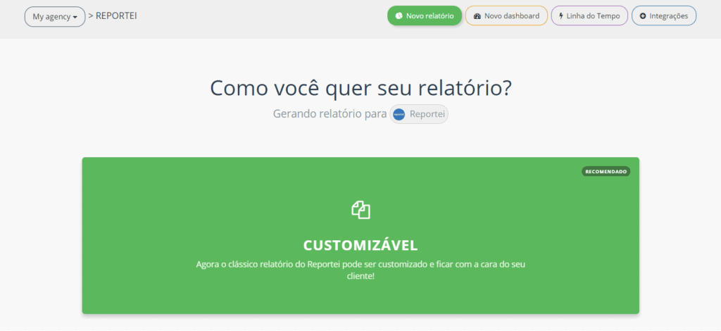 Mas onde encontrar esses templates de relatório no Reportei depois? É muito simples: ao acessar a aba de “Novo relatório”, você terá, logo abaixo da opção “Customizável”, a alternativa “Selecionar um dos meus templates”.