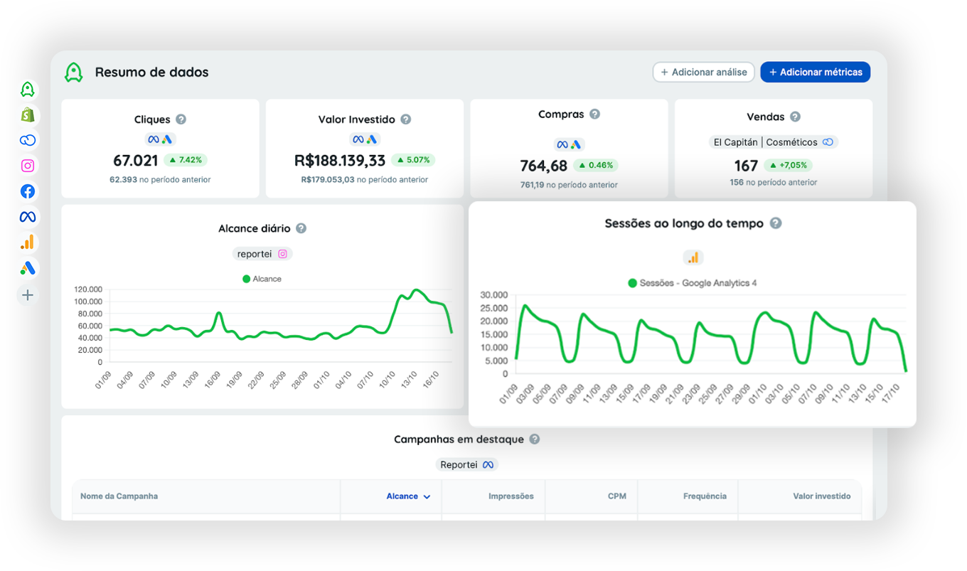 No Reportei, criamos soluções de dashboards focadas em marketing digital e vendas, como campanhas de tráfego pago, mídias sociais, CRMs e e-commerces, em um único lugar.