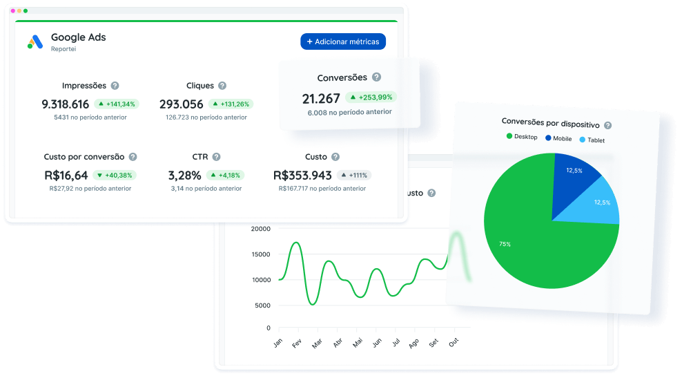 Acompanhe a performance das suas campanhas com os relatórios e dashboards de Google Ads do Reportei