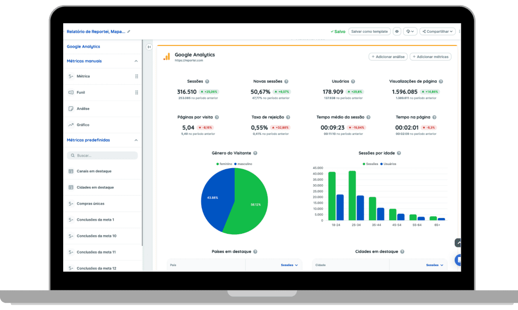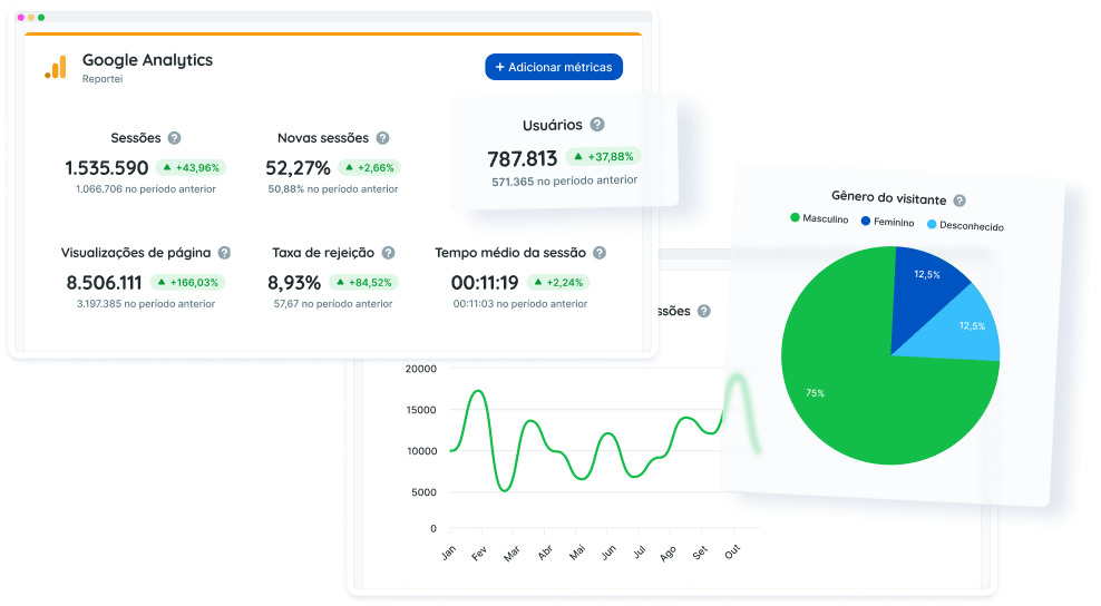 No relatório e dashboards de Google Analytics do Reportei, você fica por dentro, de uma maneira muito mais simples, dos principais dados que apontam para a performance do seu site. Tudo isso em apenas três segundos!